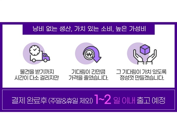 · 배송은 입금확인된 날짜로부터 1~3일 소요되며 최대 7일 이내 출고됩니다. ( 공휴일, 기상악화 등 불가피한 상황에 따라 추가 지연될 수 있습니다.)