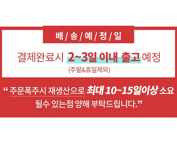 · 배송은 입금확인된 날짜로부터 1~3일 소요되며 최대 7일 이내 출고됩니다. ( 공휴일, 기상악화 등 불가피한 상황에 따라 추가 지연될 수 있습니다.)