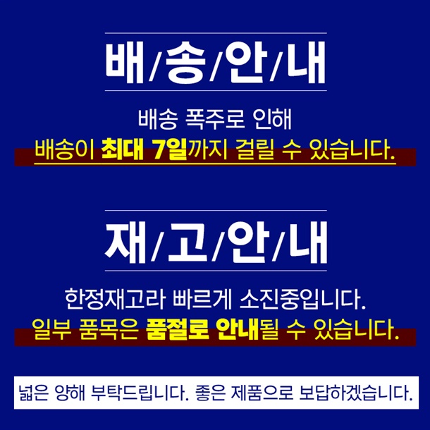 · 배송은 입금확인된 날짜로부터 1~3일 소요되며 최대 7일 이내 출고됩니다. ( 공휴일, 기상악화 등 불가피한 상황에 따라 추가 지연될 수 있습니다.)