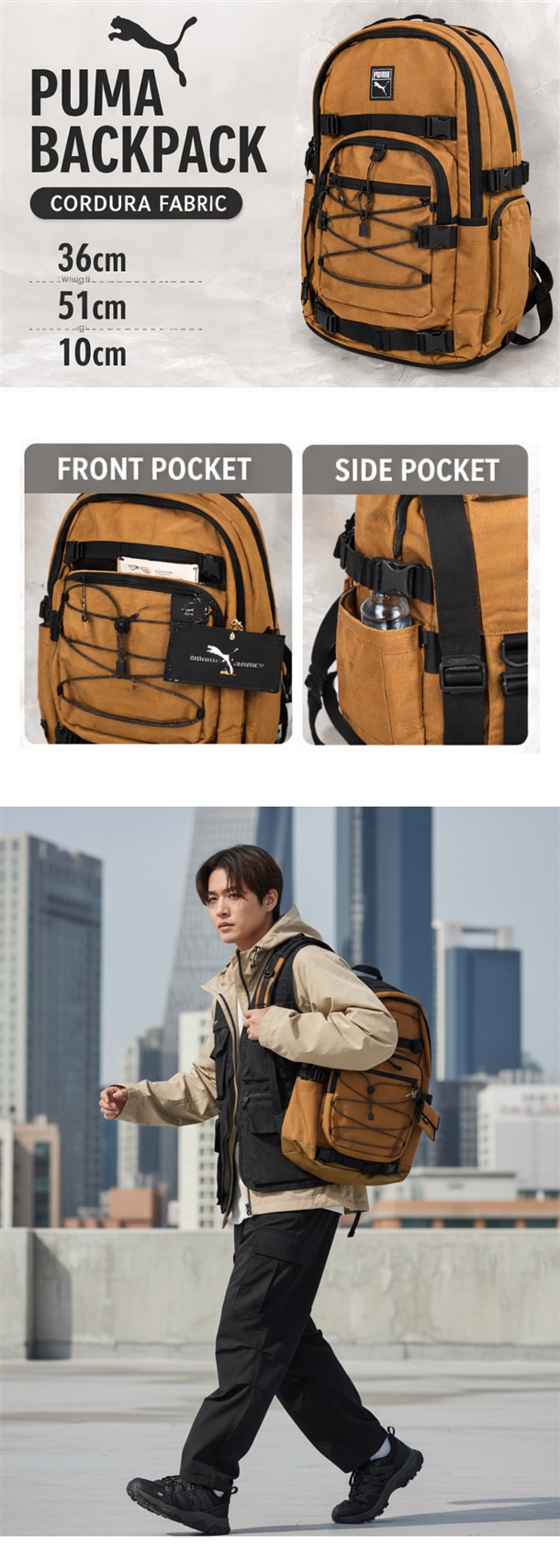 브라운 컬러 포인트로 어떤 스타일에도 자연스럽게 어울리는 데일리 백팩입니다.