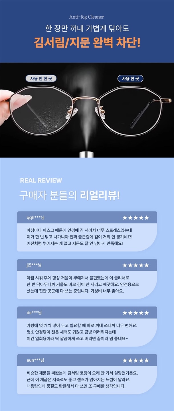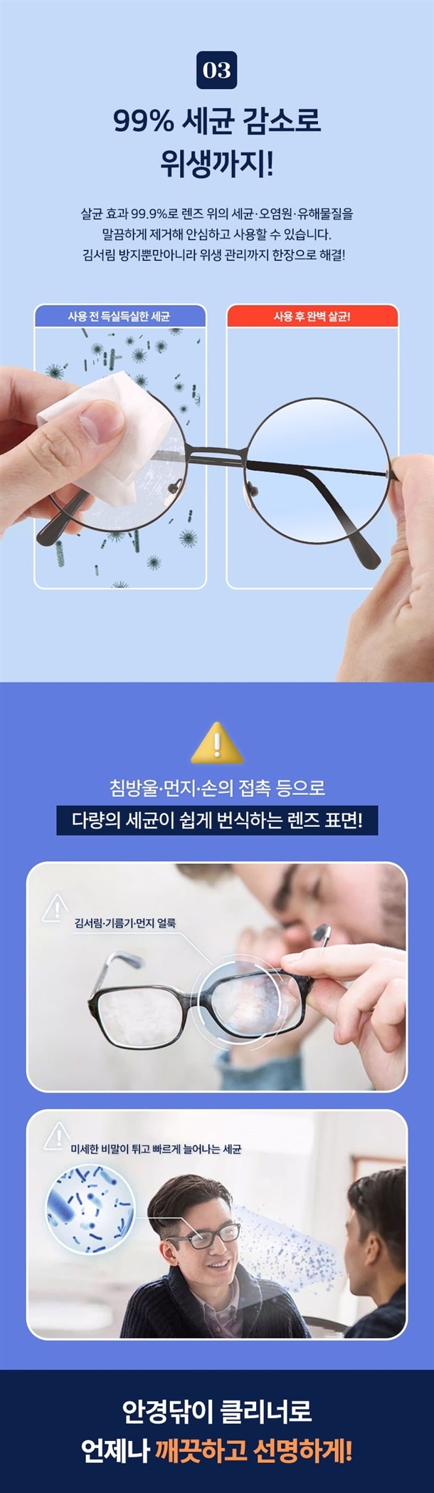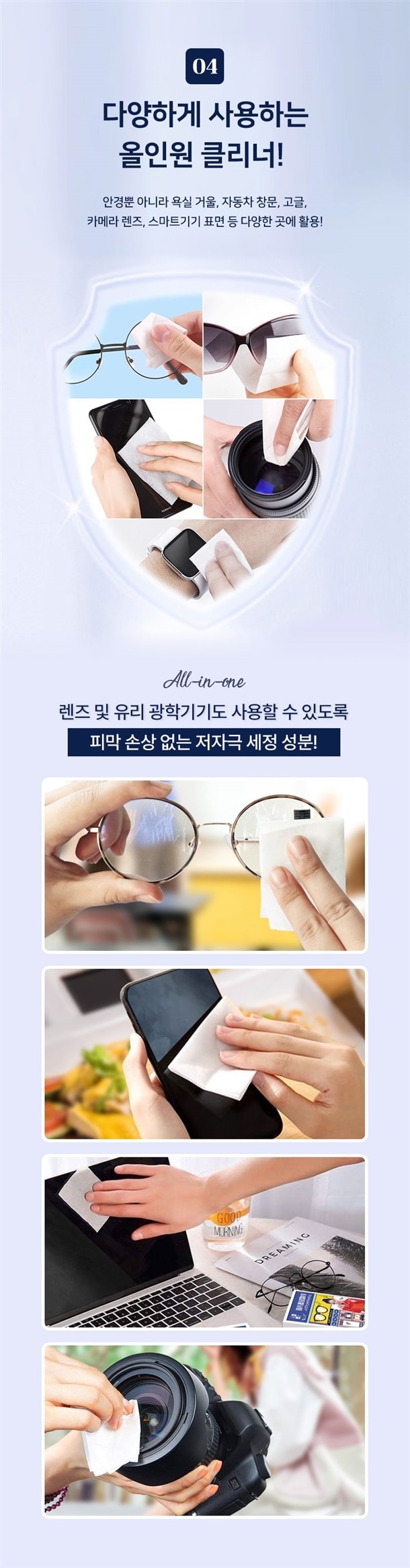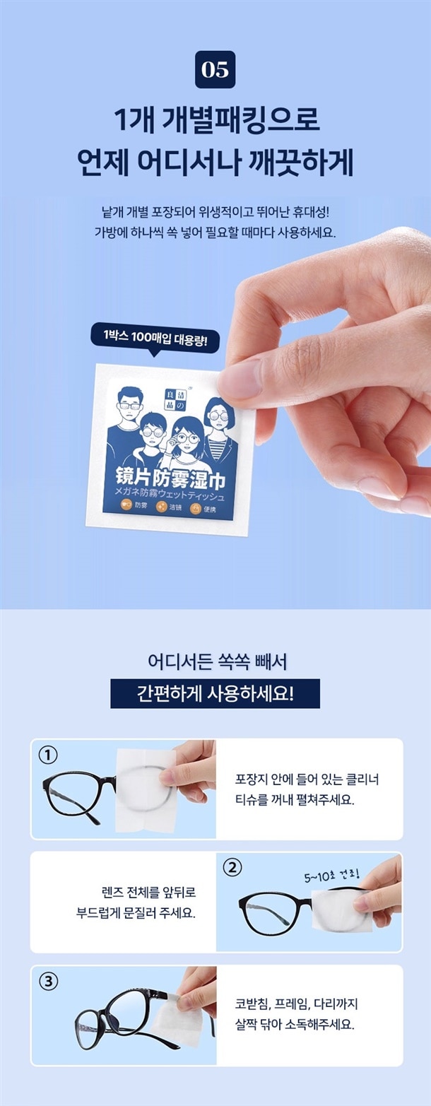 이제 겨울이라 입김에, 뜨거운 연기에 김서림 걱정이였는데 일회용 포장으로 가지고 외출하기도 너무 좋아서 외출 걱정도 없어요~ㅋ 게다가 핸드폰 화면, 컴퓨터, 패드, 거울 지문 있는 곳 쓱- 닦아주기만 해도 마법처럼 깨끗해져요!