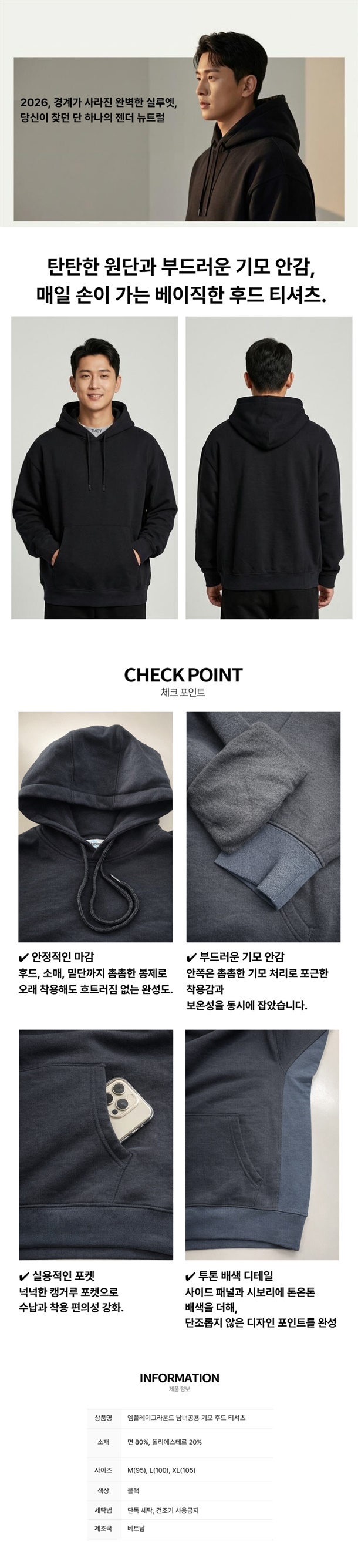 부드러운 기모 안감으로 한겨울까지 따뜻하게 착용 가능한 데일리 후드티셔츠