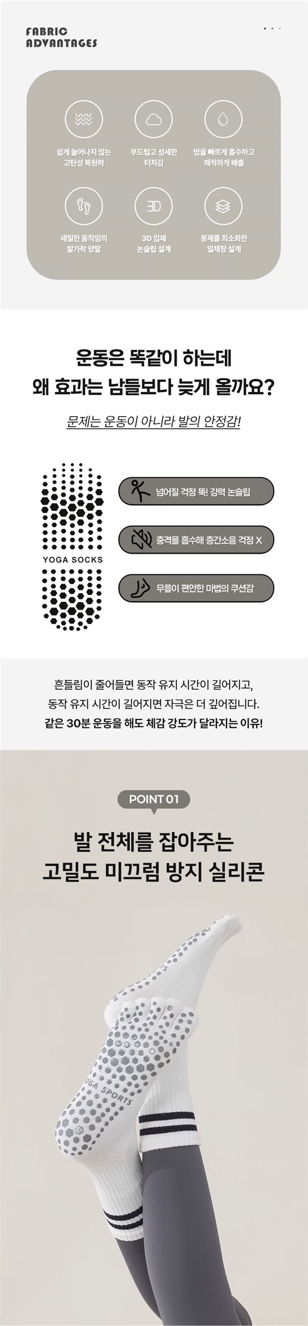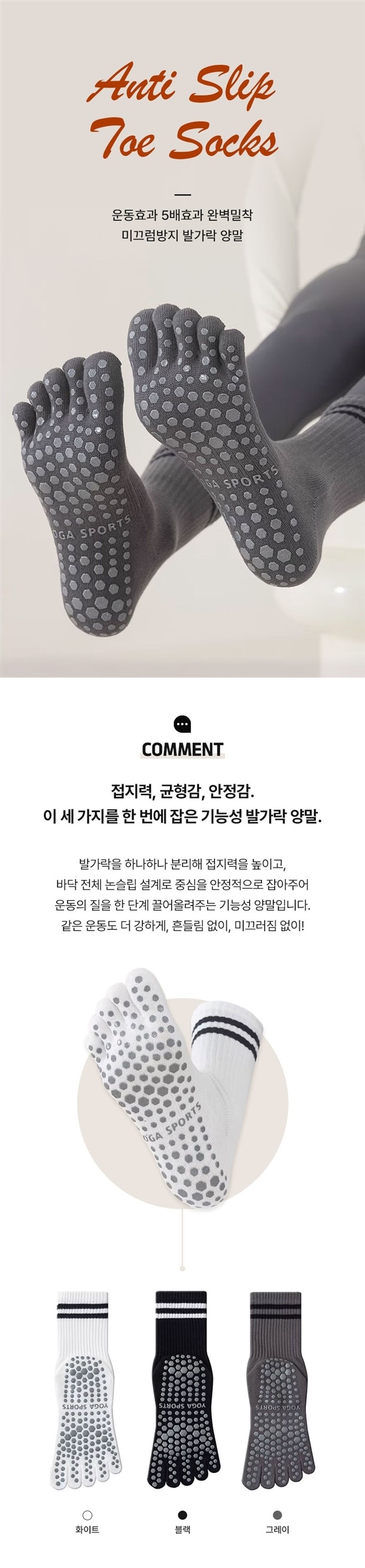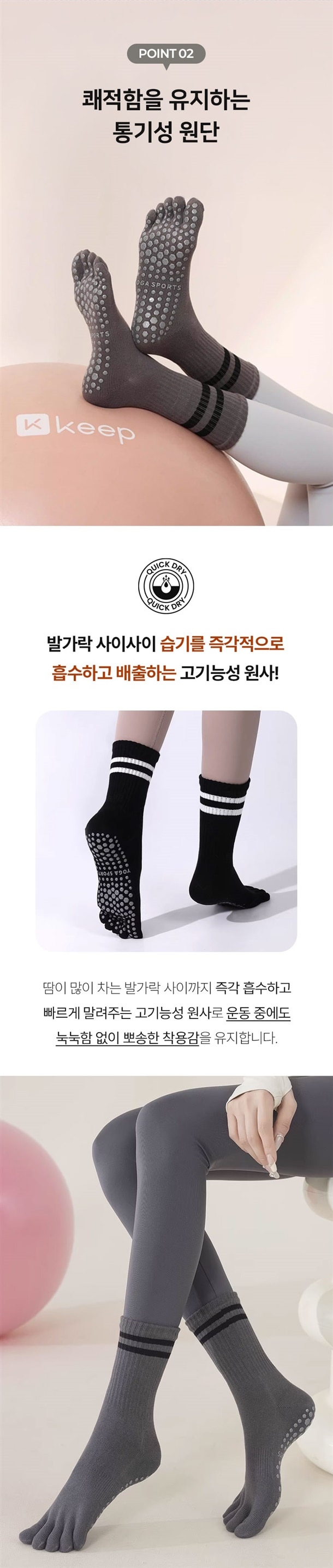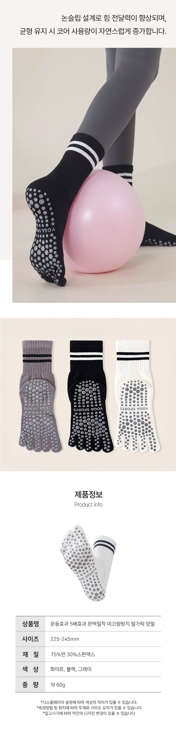 이 양말은 발바닥 전체에 논슬립 도트가 촘촘하게 잡혀 있어서 매트 위에서 발이 딱 고정되는 느낌이 바로 와요 ? 맨발로 할 때보다 중심 잡기 훨씬 쉽고, 발에 힘이 새지 않으니까 동작 하나하나가 더 정확해지더라고요. 그래서 괜히 운동효과가 더 크게 느껴지는 느낌이에요 ??