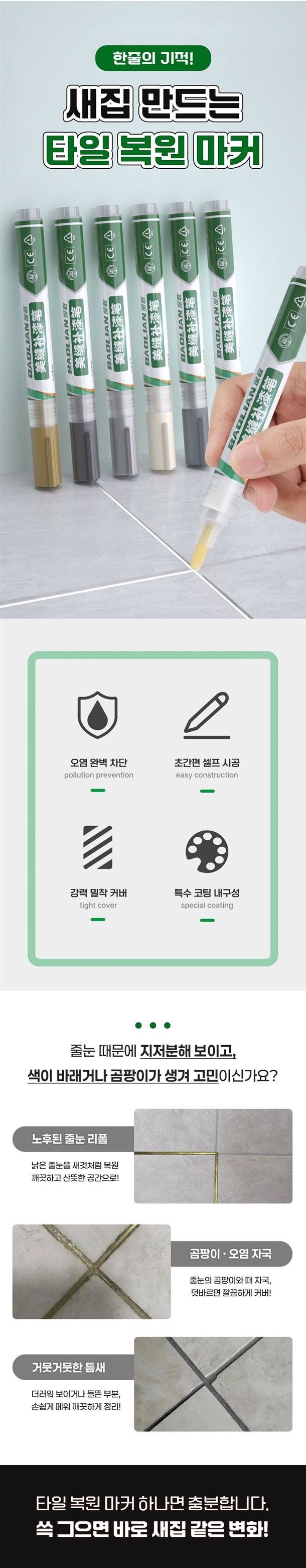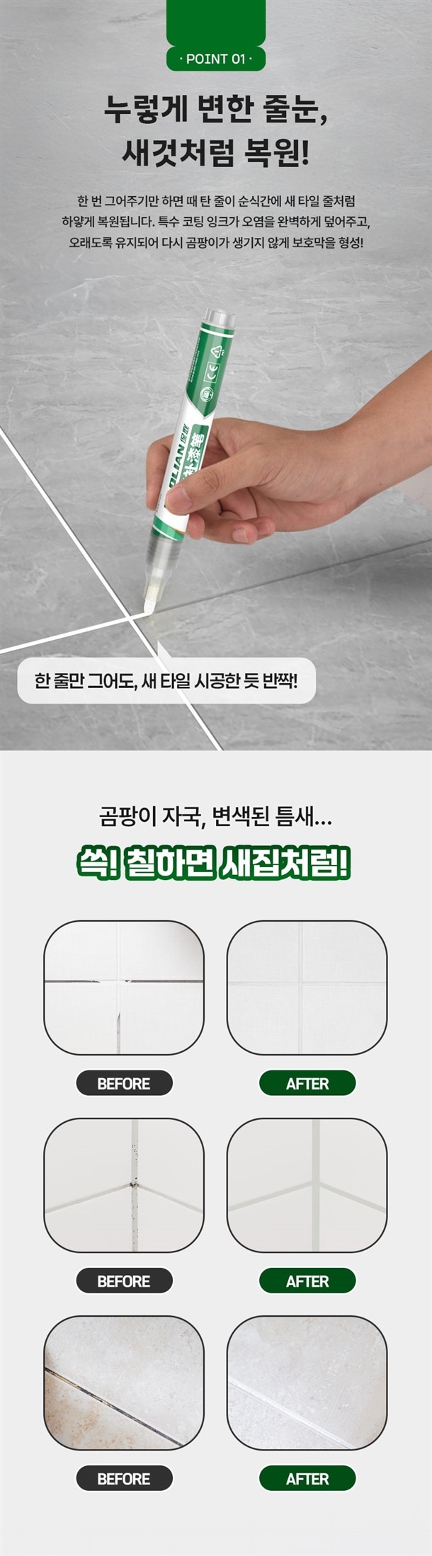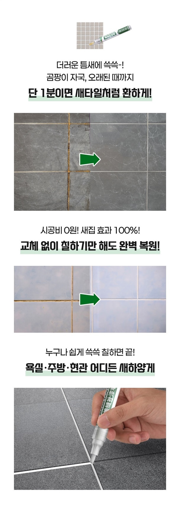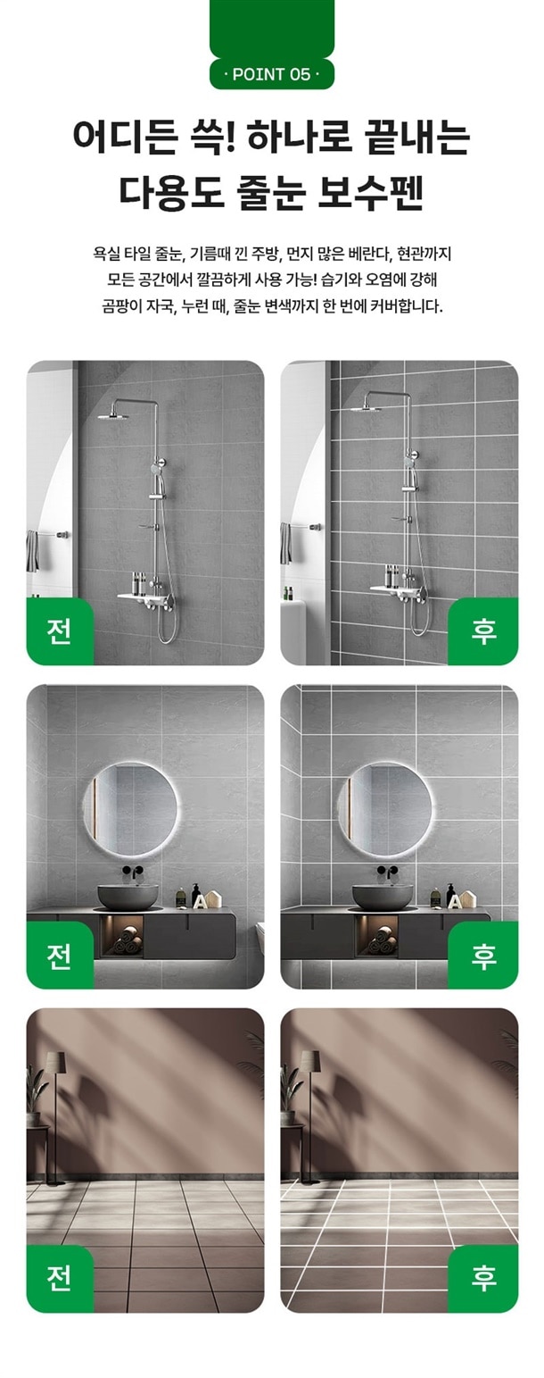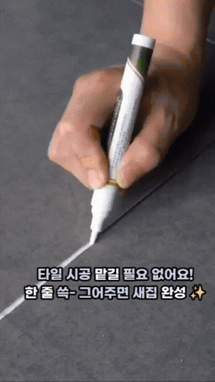 묵은때 낀 타일 줄 때문에 욕실이 칙칙해서 고민이였는데~ ㅠ 이 펜으로 한 줄 슥~ 그어주니까 새로 시공한 줄 알았어요ㅎㅎ 색이 워낙 선명해서 오래된 때나 곰팡이 자국도 완벽 커버 돼요! 물기 있는 욕실, 주방 타일까지 문제없이 착 붙구요~