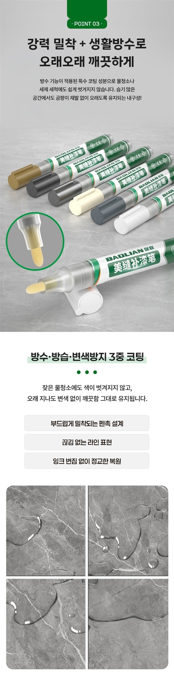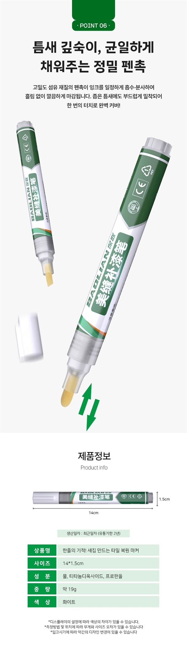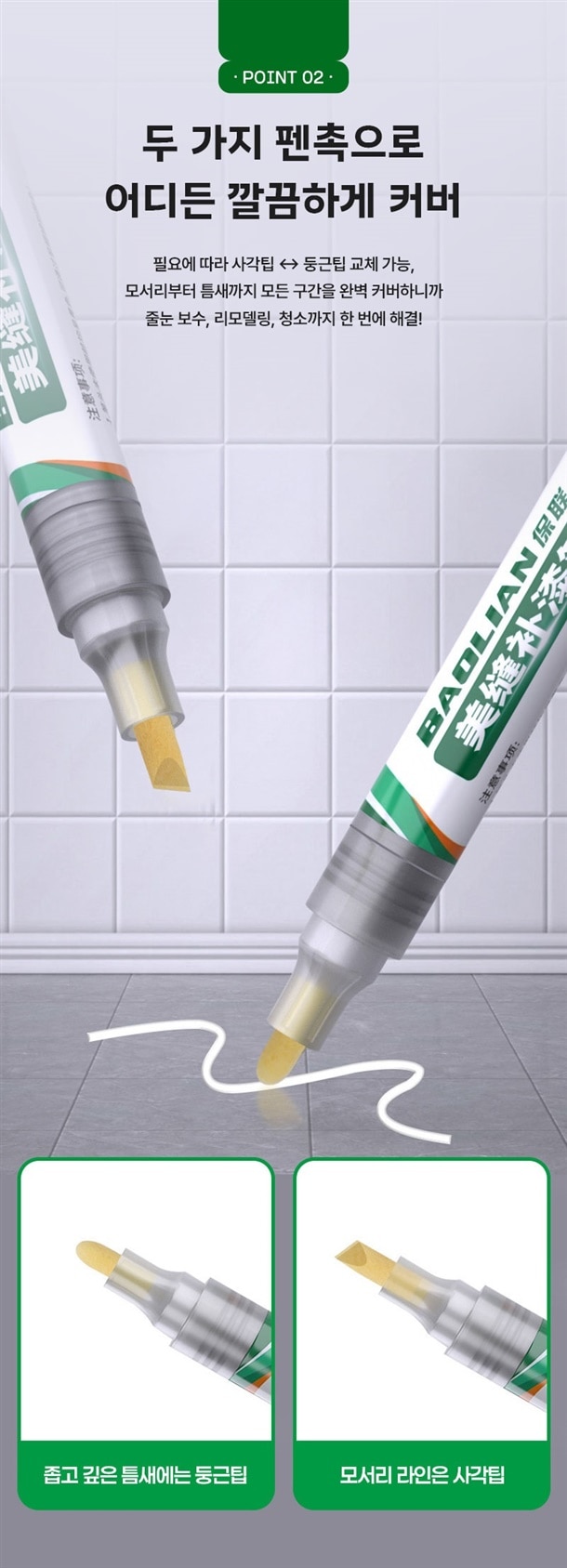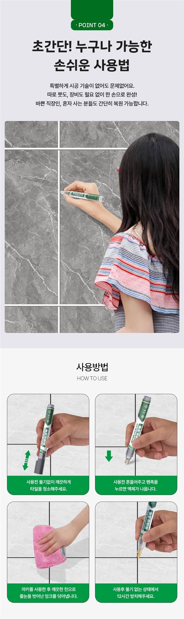 묵은때 낀 타일 줄 때문에 욕실이 칙칙해서 고민이였는데~ ㅠ 이 펜으로 한 줄 슥~ 그어주니까 새로 시공한 줄 알았어요ㅎㅎ 색이 워낙 선명해서 오래된 때나 곰팡이 자국도 완벽 커버 돼요! 물기 있는 욕실, 주방 타일까지 문제없이 착 붙구요~