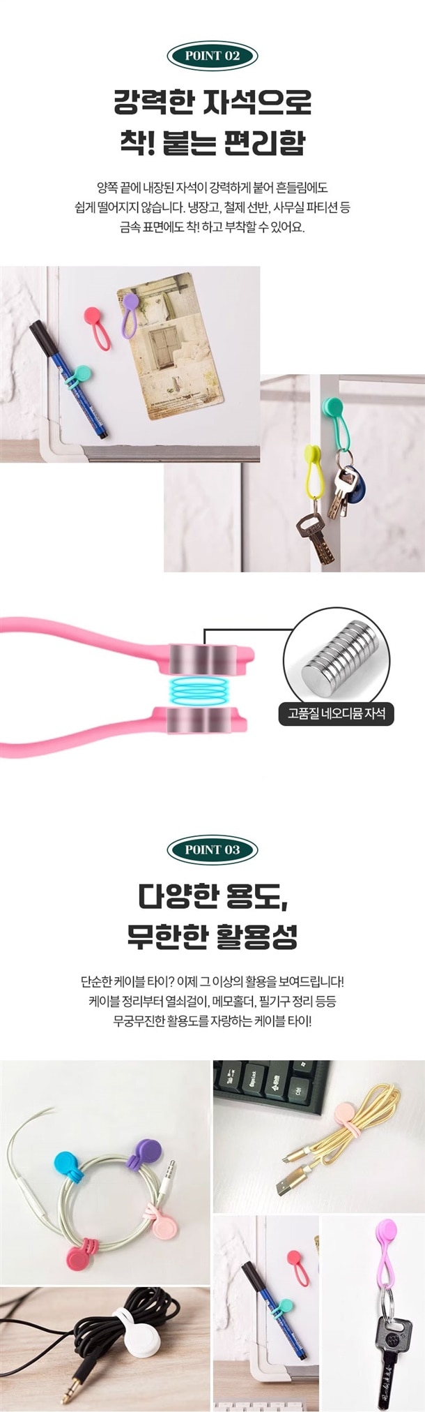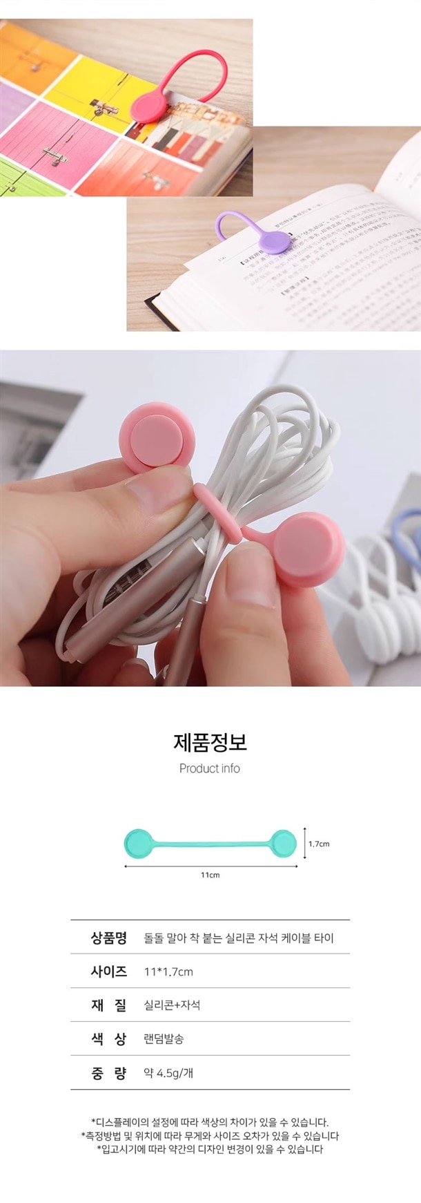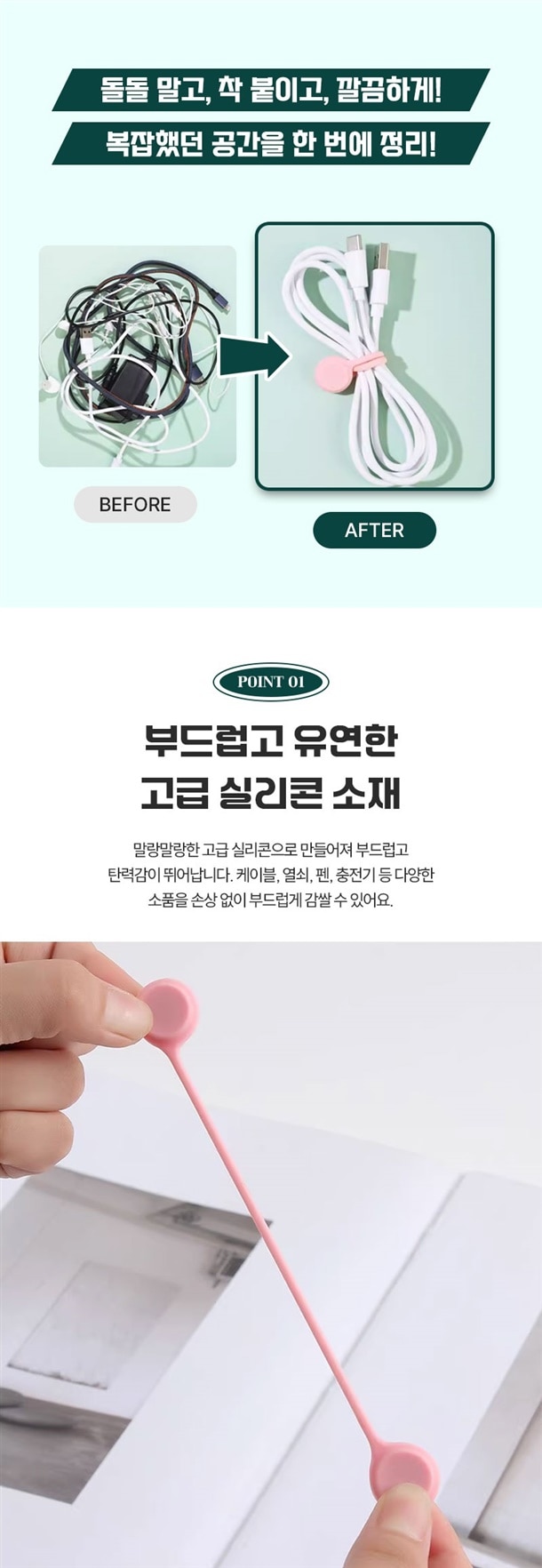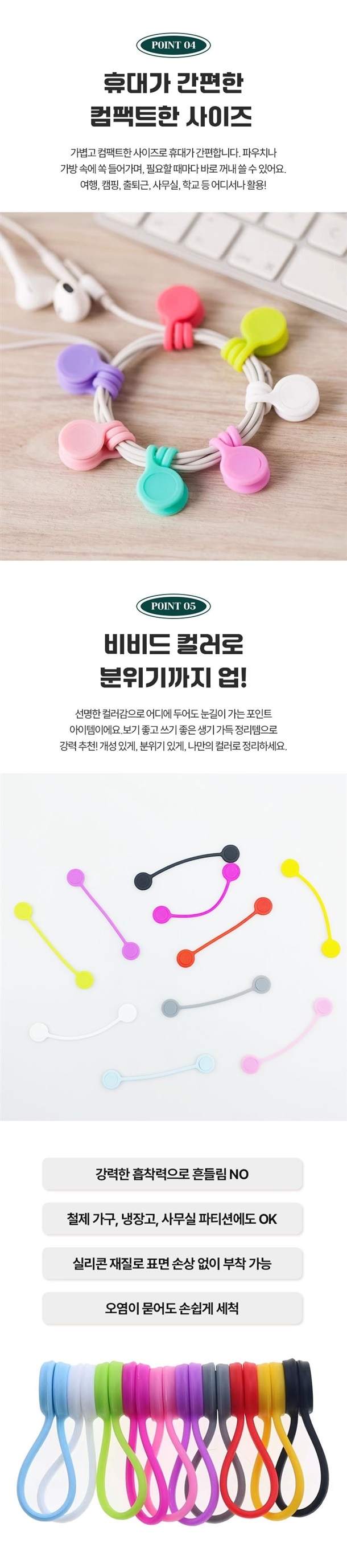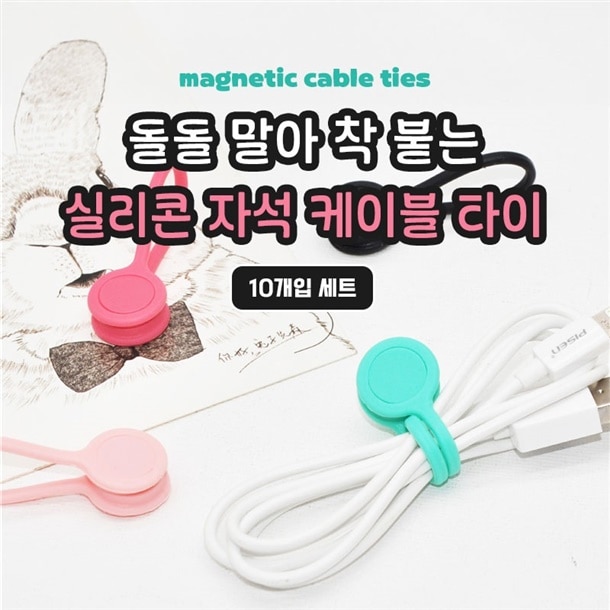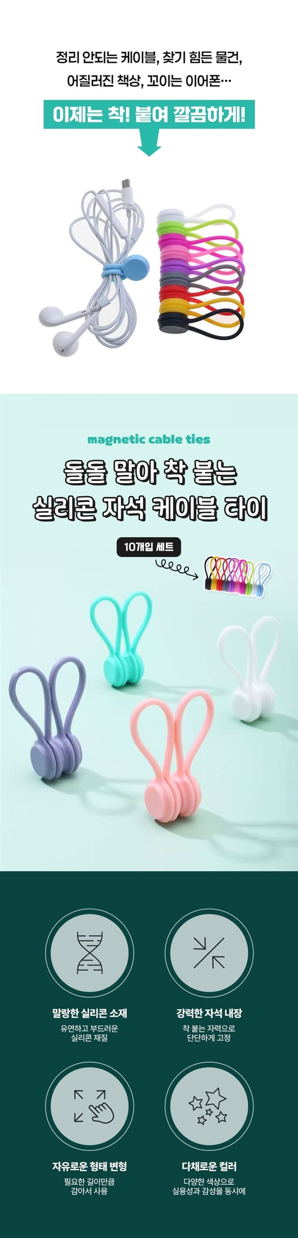 돌돌 말아서 끝에 착 붙이기만 하면 깔끔하게 정리되고, 필요할 때 바로 풀 수 있습니다! 실리콘이라 부드럽고 케이블에 흠집도 안 나서 마음 놓고 사용할 수 있어요. 자석도 생각보다 강력해서 케이블끼리 붙어 흩어지지 않고, 여러 개 색상으로 구분해서 사용하니 한눈에 정리가 돼서 좋네요.