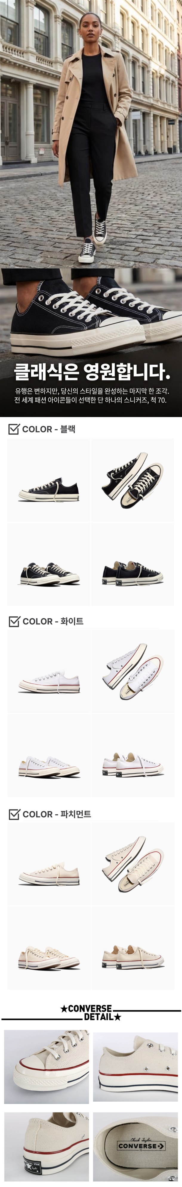 빈티지 감성과 업그레이드된 착화감을 갖춘 Chuck 70 클래식 로우 스니커즈.