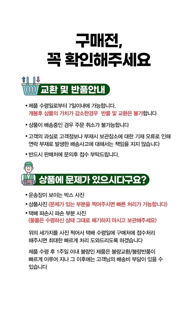 · 상품 불량 사유와 사진을 남겨 주시면 빠른 처리가 가능합니다.