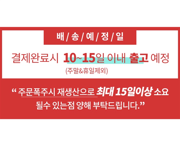 · 배송은 입금확인된 날짜로부터 1~3일 소요되며 최대 7일 이내 출고됩니다. ( 공휴일, 기상악화 등 불가피한 상황에 따라 추가 지연될 수 있습니다.)