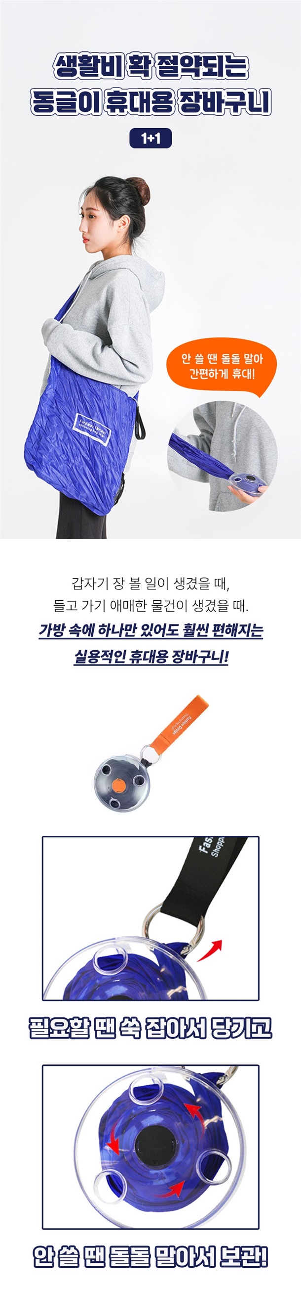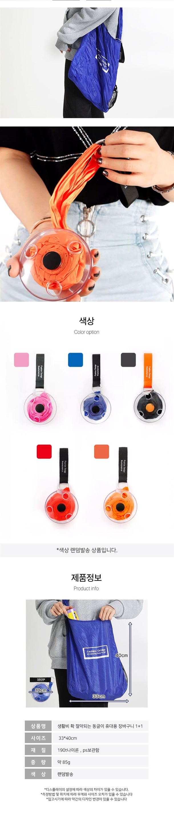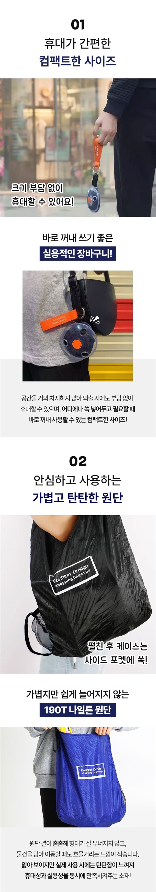 손바닥만 한 케이스에 쏙 들어가서 가방에 휴대용으로 넣고 다니기 너무 편하고, 필요할 땐 케이스에서 꺼내서 쭉 펼치면 엄청 큰 장바구니가 딱 완성돼요.