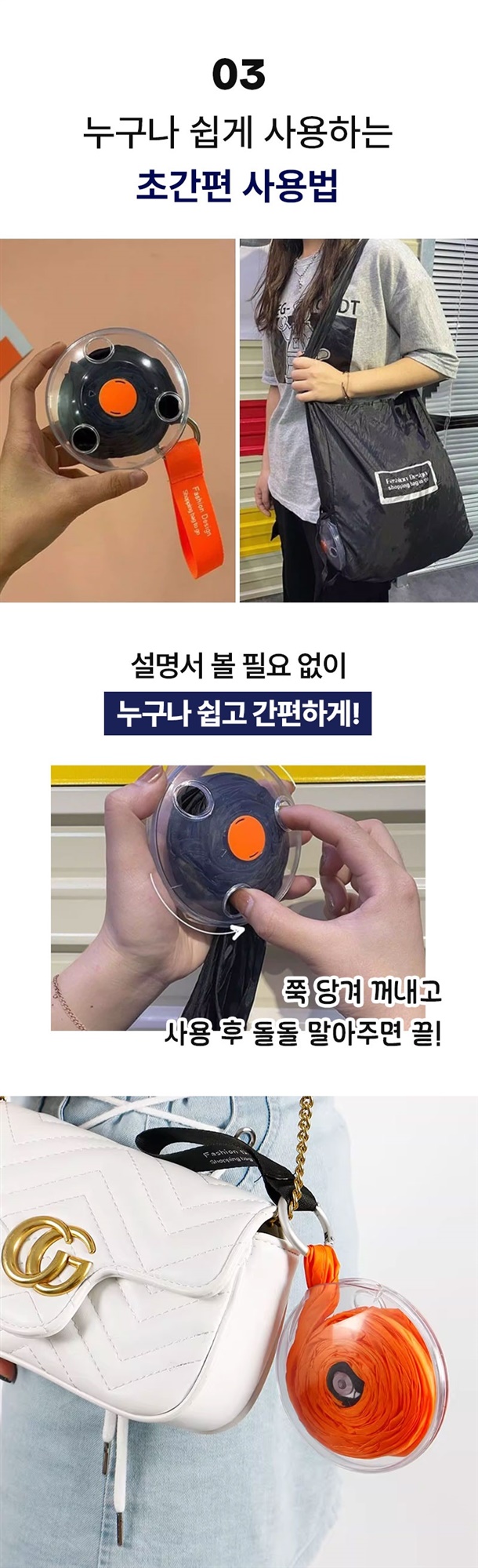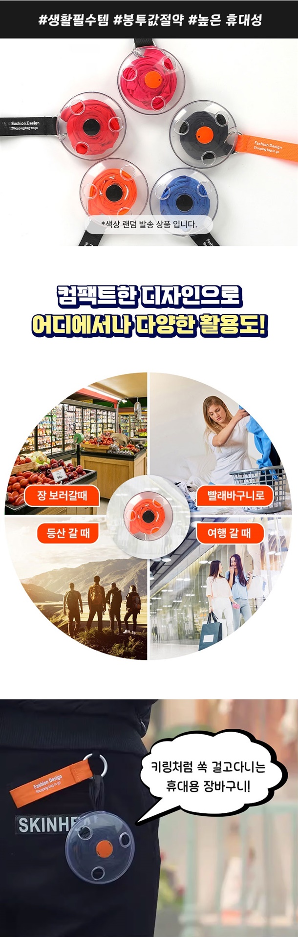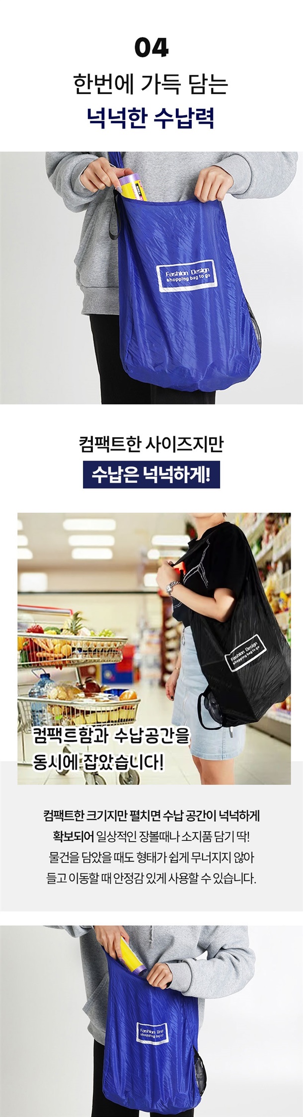 손바닥만 한 케이스에 쏙 들어가서 가방에 휴대용으로 넣고 다니기 너무 편하고, 필요할 땐 케이스에서 꺼내서 쭉 펼치면 엄청 큰 장바구니가 딱 완성돼요.