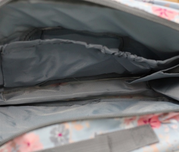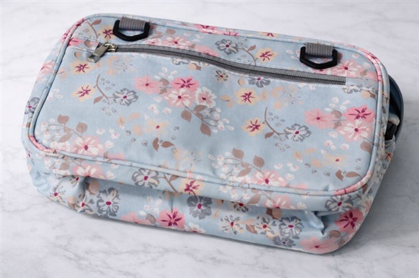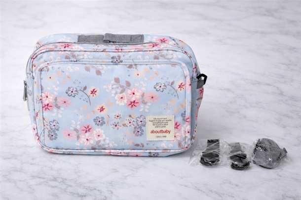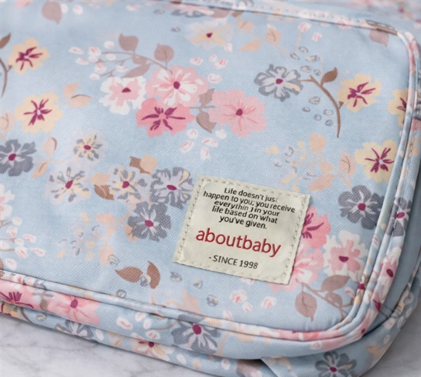 기저귀와 소지품을 깔끔하게 수납할 수 있는 플라워 패턴 유모차 전용 정리 가방입니다.