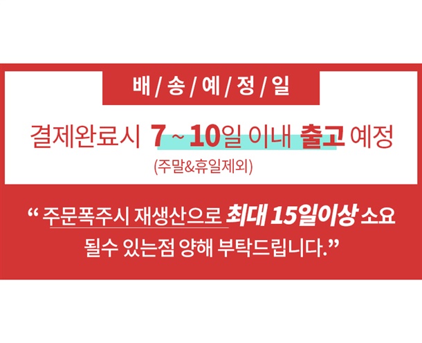 · 배송은 입금확인된 날짜로부터 1~3일 소요되며 최대 7일 이내 출고됩니다. ( 공휴일, 기상악화 등 불가피한 상황에 따라 추가 지연될 수 있습니다.)