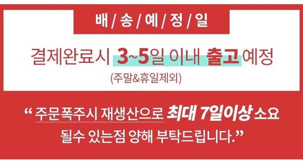 · 배송은 입금확인된 날짜로부터 1~3일 소요되며 최대 7일 이내 출고됩니다. ( 공휴일, 기상악화 등 불가피한 상황에 따라 추가 지연될 수 있습니다.)
