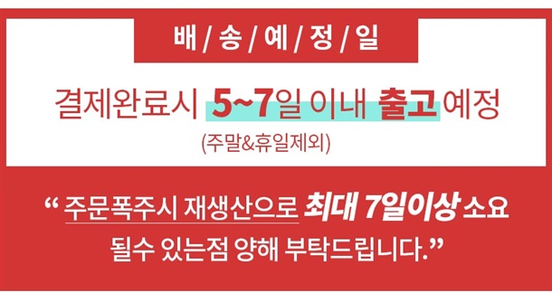 · 배송은 입금확인된 날짜로부터 1~3일 소요되며 최대 7일 이내 출고됩니다. ( 공휴일, 기상악화 등 불가피한 상황에 따라 추가 지연될 수 있습니다.)