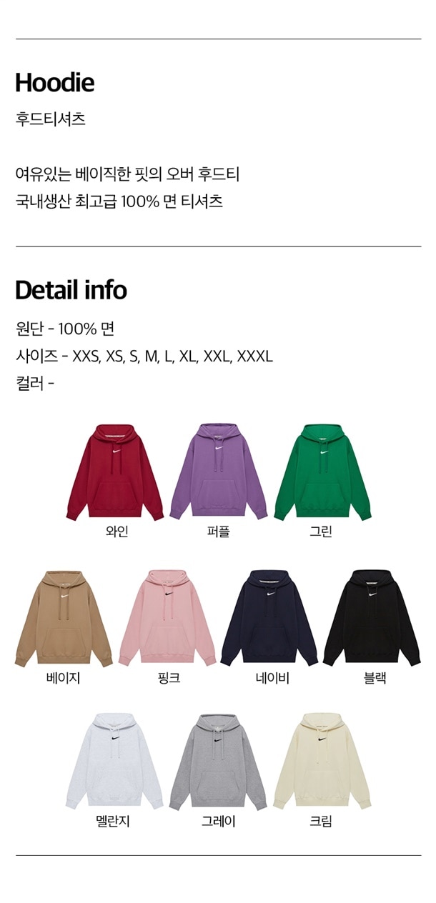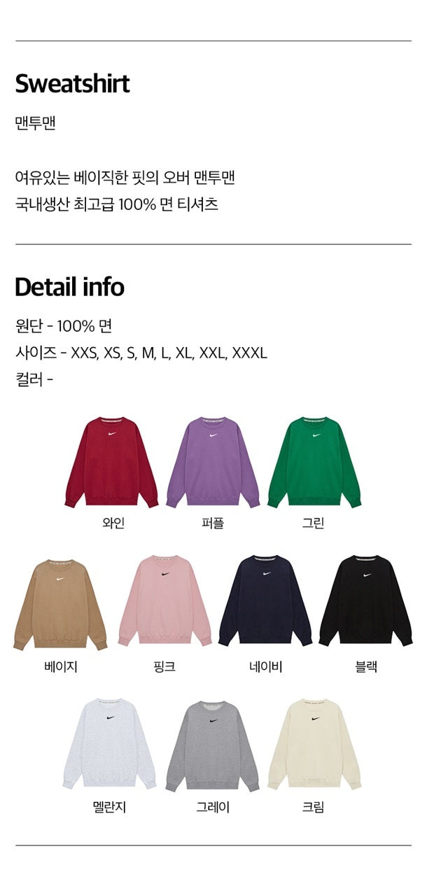 주니어XXS~여성남성빅사이즈 XXXL 까지! 부드럽고 깔끔한 고급 면 100%의 맨투맨&후드
