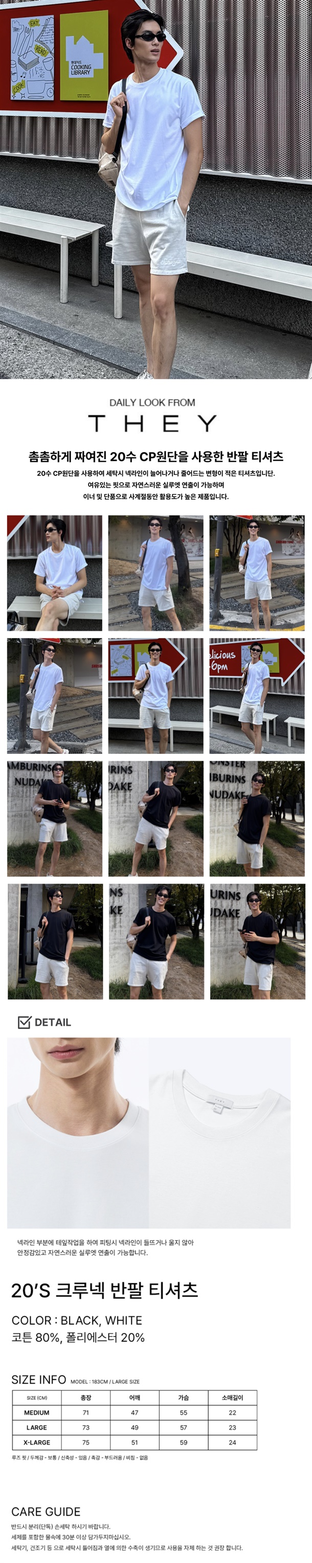 탄탄한 20수 코튼 원단과 깔끔한 핏으로 데일리하게 입기 좋은 THEY 데이 크루넥 반팔 티셔츠.