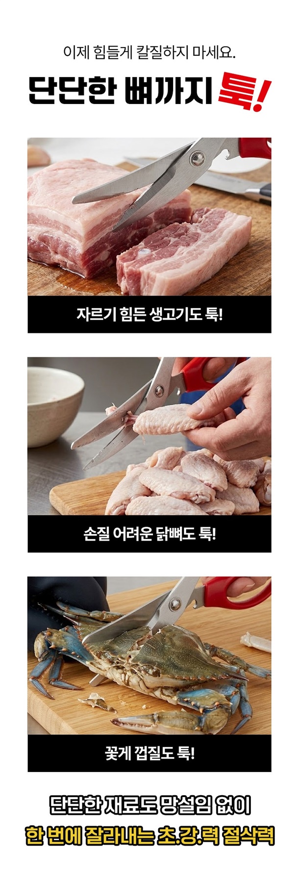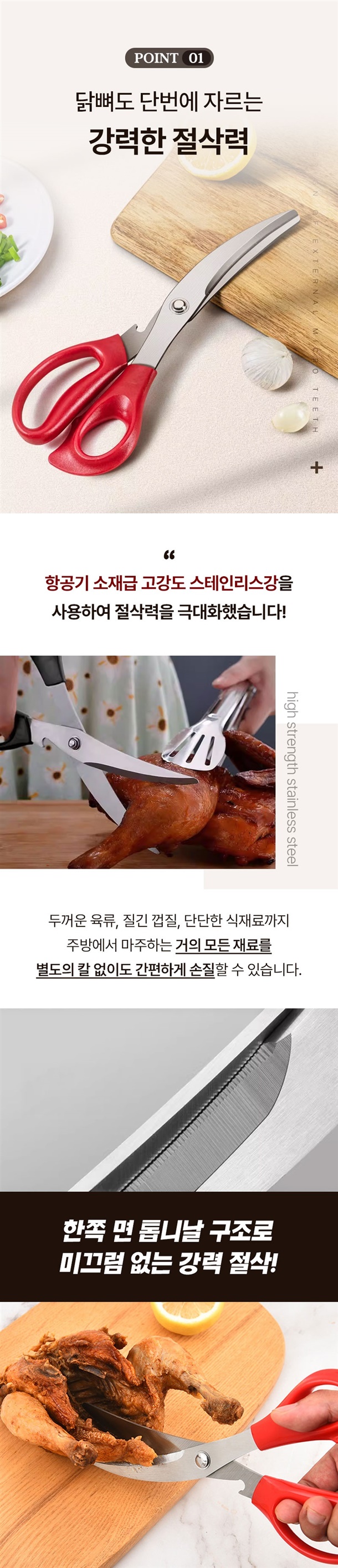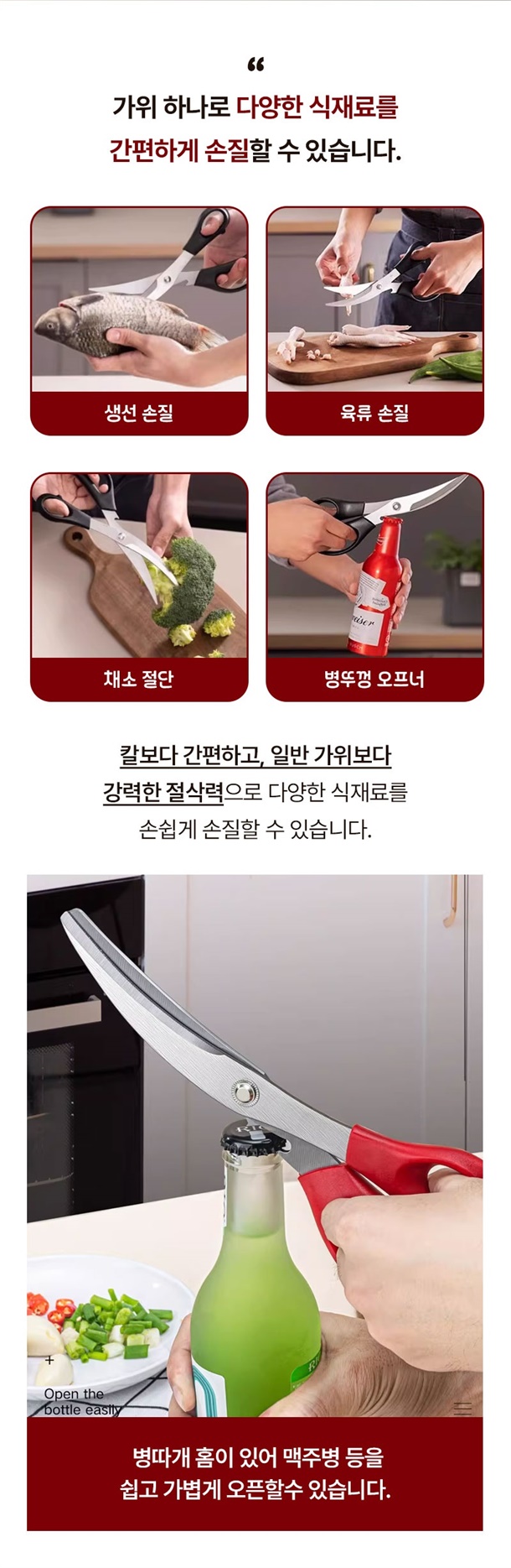 평소에 고기만 자르던 가위로는 닭뼈나 돼지뼈 자를 때 힘들었는데 이건 진짜 뚝딱 잘려서 놀랐어요. 손목에 힘 거의 안 주고도 잘려서 요리할 때 피로감도 확 줄었네요. 게다가 병따개까지 있어서 주방에서 이것만 있으면 웬만한 건 다 해결돼요.