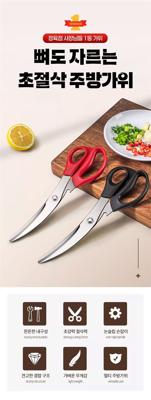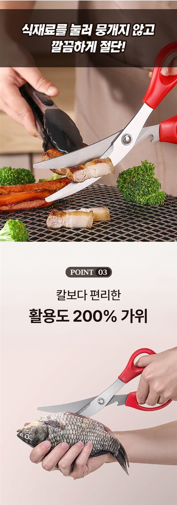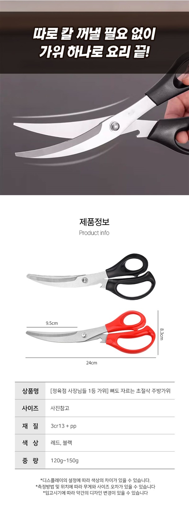 평소에 고기만 자르던 가위로는 닭뼈나 돼지뼈 자를 때 힘들었는데 이건 진짜 뚝딱 잘려서 놀랐어요. 손목에 힘 거의 안 주고도 잘려서 요리할 때 피로감도 확 줄었네요. 게다가 병따개까지 있어서 주방에서 이것만 있으면 웬만한 건 다 해결돼요.