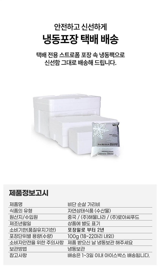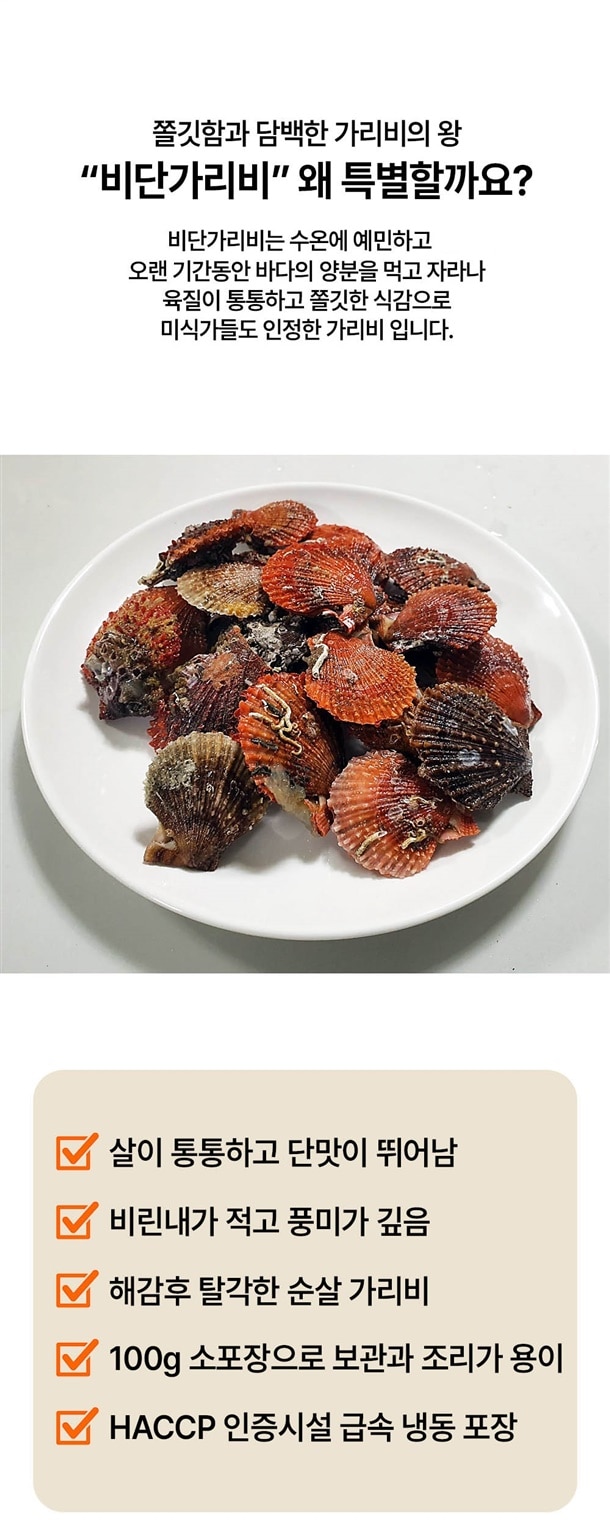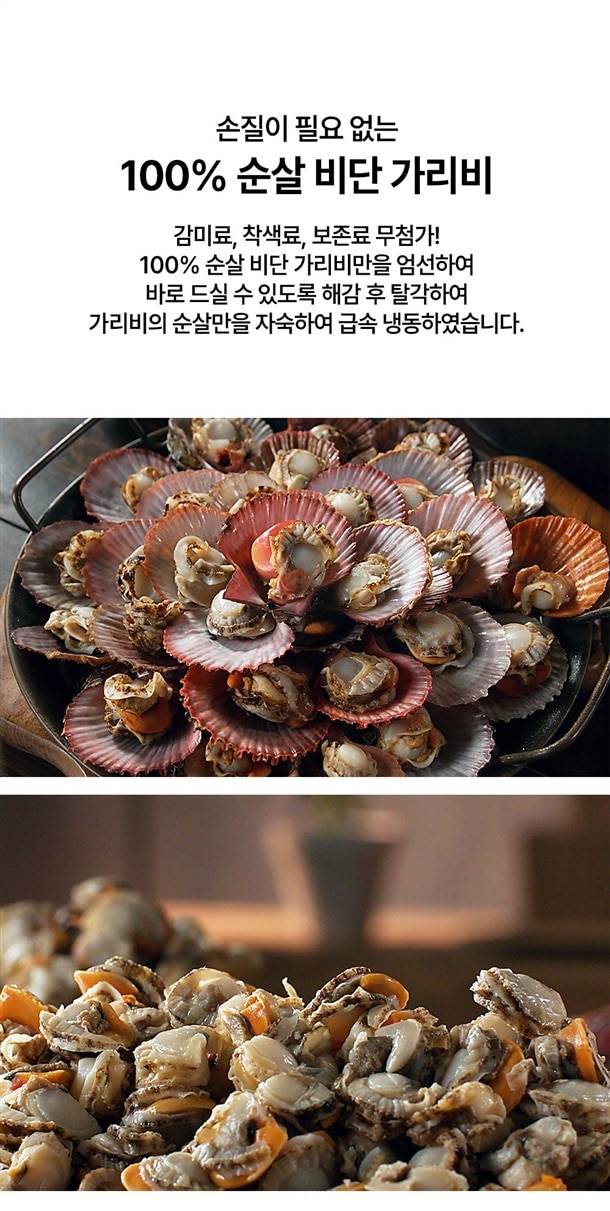 해감후 탈각하여 가리비 순살만을 자숙하여 급속냉통한 제품으로 가정에서 해동후 바로 섭취가 가능함